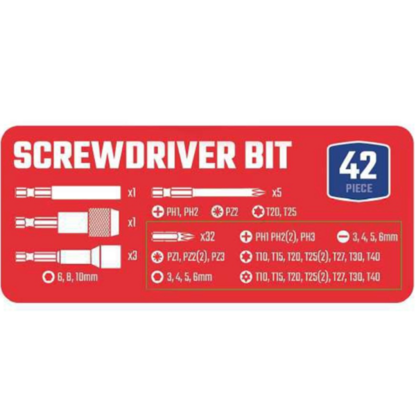 - ۵ سری پیچگوشتی ستارهای در سایزهای T۵۵ , T۶۰ , T۵۰ , T۴۵ , T۴۰ - ۲ سری پیچگوشتی چهارسوی خاردار در سایزهای PZ۳ , PZ۴ - ۲ سری پیچگوشتی چهارسو در سایزهای PH۳ , PH۴ - ۳ سری پیچگوشتی دوسو در سایزهای ۸ و ۱۰ و ۱۲ - ۵ سری پیچگوشتی آلنی در سایزهای ۷ و ۸ و ۱۰ و ۱۲ و ۱۴ - ۲ سری پیچگوشتی چهارسو با درایو ۱/۴ اینچی در سایزهای