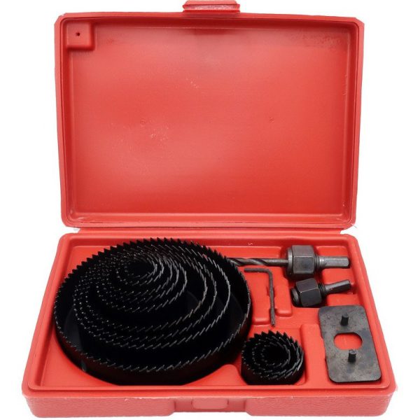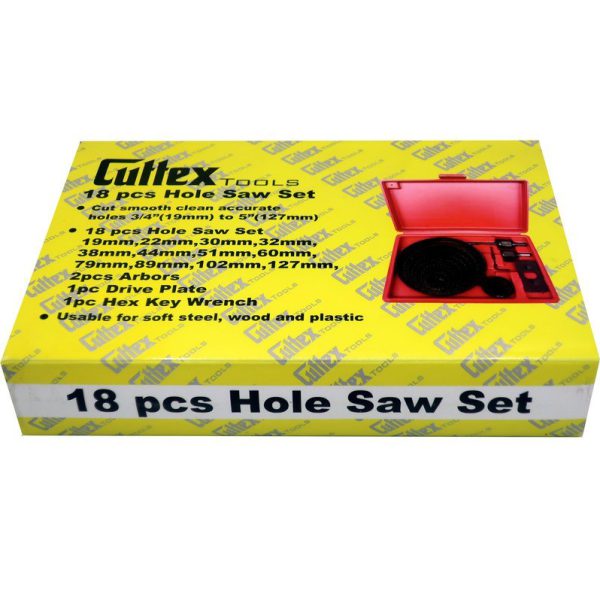 مجموعه 18 پارچه کاتکس شامل 12 عدد مته گردبر با شماره های 19-22-30-32-38-44-51-60-79-89-102 و 127 و دو عدد رابط گردبر و اچار الن است که مناسب برای سوراخ کاری فلزات نرم ام دی اف چوب نئوپان پلاستیک پی وی سی است و در خانه یا کارگاه برای سوراخ لامپ سقفی سوراخ لوله جای کلید و پریز مناسب است