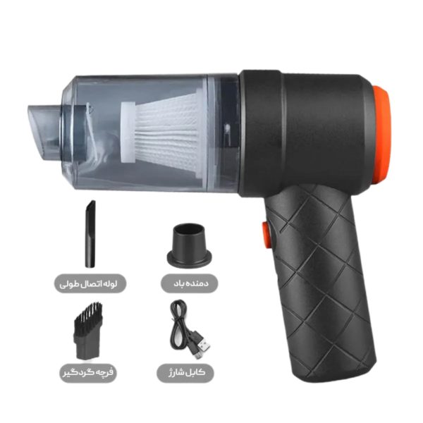 دارای لوله خرطومی ، دو عدد سری جارو برقی ، کابل اتصال به باطری ، شلنگ باد